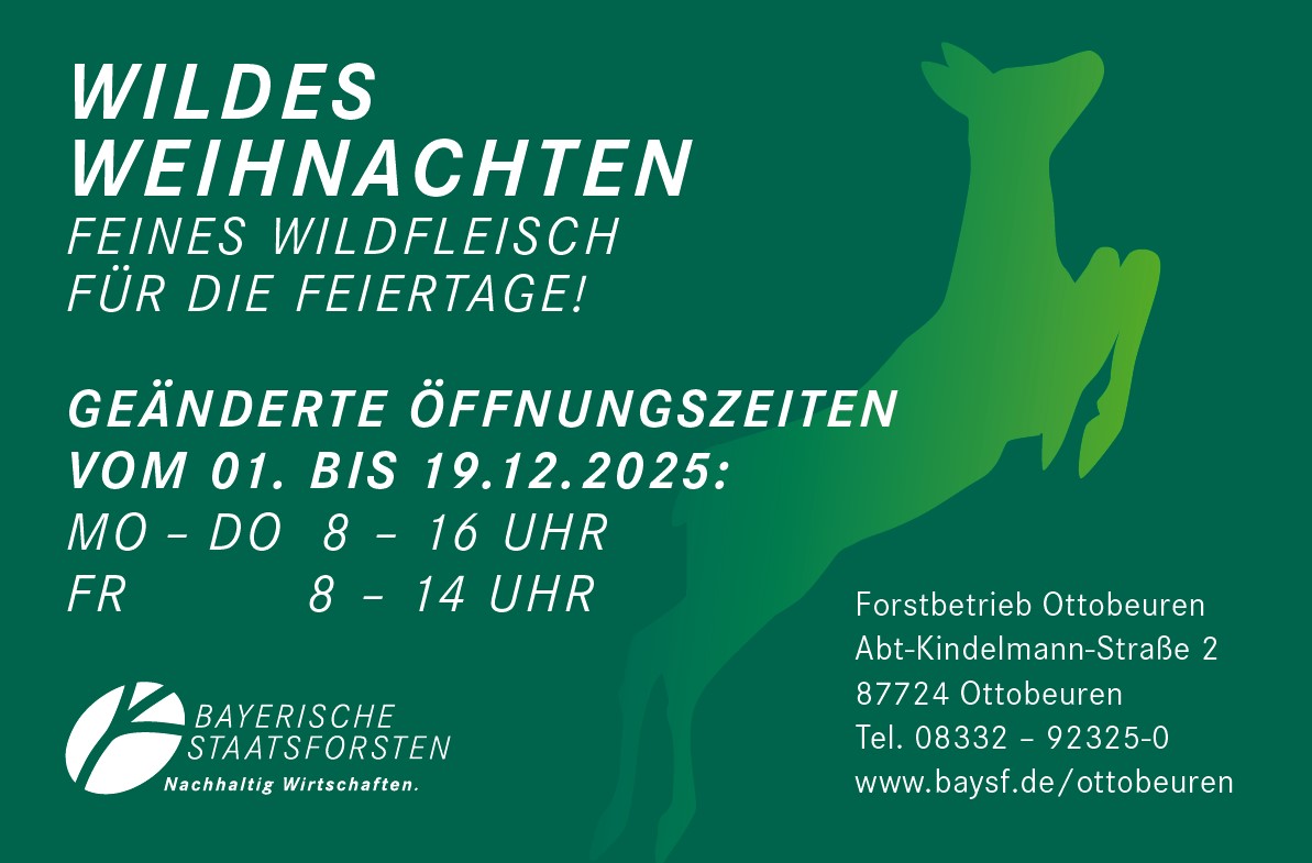 Der Forstbetrieb Ottobeuren bietet ganzjährig Wildbret vom Reh und Wildschwein an, welches von unseren Jägerinnen und Jägern vor Ort erlegt wurde.